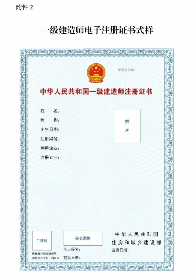 1.自2021年10月15日起,在全國范圍內實行一級建造師電子證書(具體示例及說明見附件1),電子證書式樣按照《全國一體化在線政務服務平臺電子證照一級建造師注冊證書》標準執行(具體式樣見附件2)。自2022年1月1日起,一級建造師統一使用電子證書,紙質注冊證書作廢。
