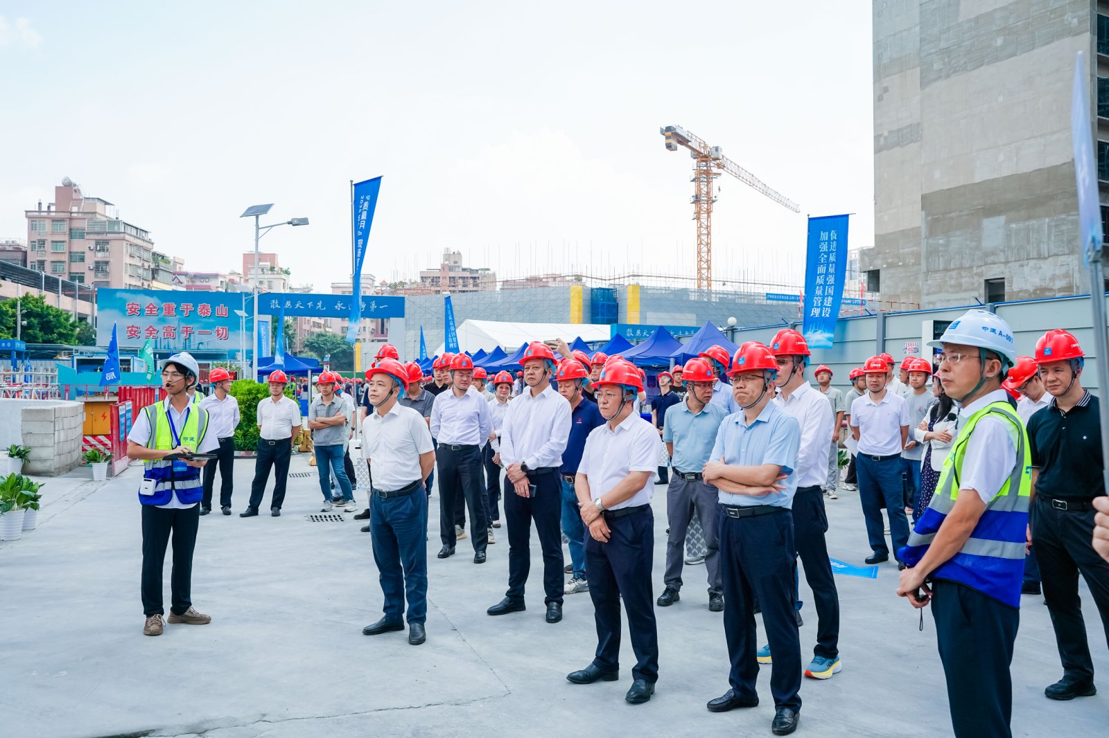 9月11日上午,由廣東省住房和城鄉(xiāng)建設廳指導,廣州市住房和城鄉(xiāng)建設局主辦,廣州市建筑業(yè)聯(lián)合會、白云區(qū)住房建設和交通局共同協(xié)辦的2025年廣州市住房城鄉(xiāng)建設系統(tǒng)“質(zhì)量月”交流觀摩活動,在中建三局集團有限公司承建的白云區(qū)鶴龍街黃邊村更新改造項目現(xiàn)場成功舉辦。本次活動以“加強全面質(zhì)量管理,促進質(zhì)量強國建設”為主題,通過交流行業(yè)先進管理經(jīng)驗、展示工程質(zhì)量創(chuàng)新成果,推動建筑工程品質(zhì)提升,滿足人民群眾對高品質(zhì)建筑的需求。廣州市住房和城鄉(xiāng)建設局黨組成員、副局長、二級巡視員王勇,市管一級調(diào)研員呂昕、建筑工程質(zhì)量安全管理處處長周澤志,廣東省住房和城鄉(xiāng)建設廳副處長、二級調(diào)研員羅家俠等出席。市區(qū)建設行政主管部門、行業(yè)協(xié)會及企業(yè)代表參加。我會副會長兼秘書長張江華出席活動。