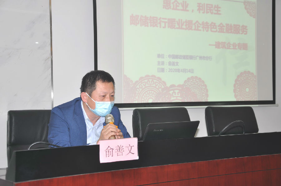 金融專業(yè)服務(wù)組專家、中國郵政儲(chǔ)蓄銀行廣州市白云支行行長俞善文進(jìn)行“惠企業(yè),利民生”暖業(yè)援企特色金融服務(wù)建筑企業(yè)專題講解,具體介紹了建筑工人工資分賬管理項(xiàng)目以及綜合金融配套服務(wù),銀行專屬服務(wù)團(tuán)隊(duì)將積極響應(yīng)政府關(guān)于加大金融對(duì)企業(yè)支持力度的號(hào)召,通過多維立體式服務(wù),全力保障企業(yè)生產(chǎn)和民生需求。