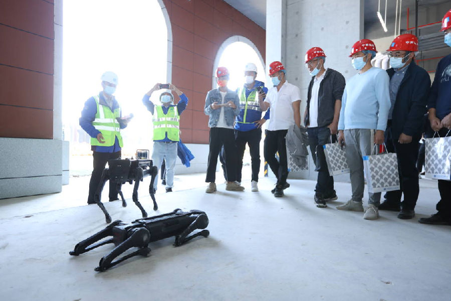觀摩現場一只好動的巡檢機器狗在跳來跳去,它能夠代替人工到施工現場進行工地巡檢,分析危險源,識別火焰、煙霧、人員未佩戴安全帽、未穿反光背心等情況,極大提高危險作業區域巡視管理效率及安全性;抹灰機器人通過高效振動和液壓提升,將砂漿平整的涂抹在墻面,解決高空作業及抹灰效能問題……