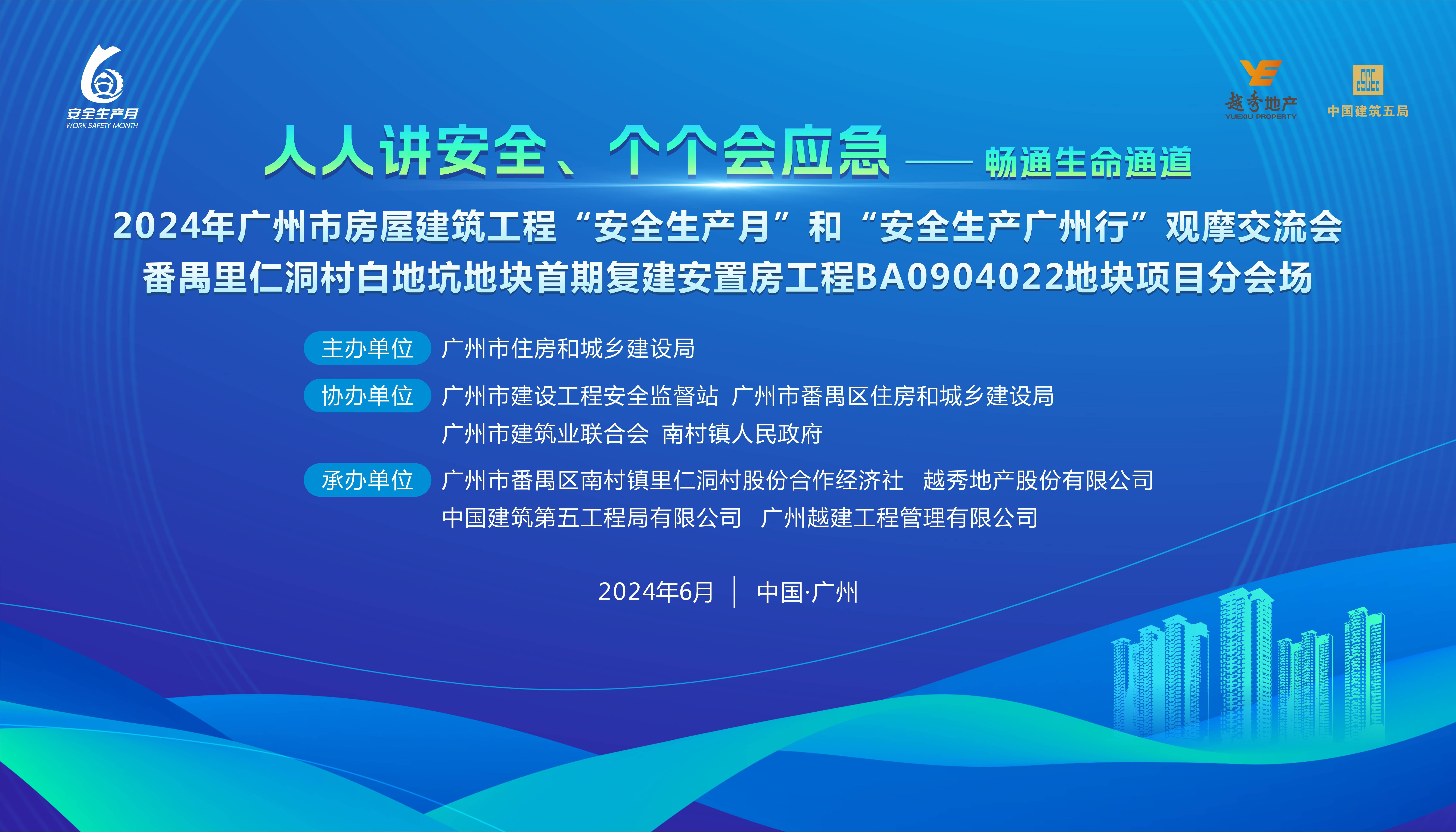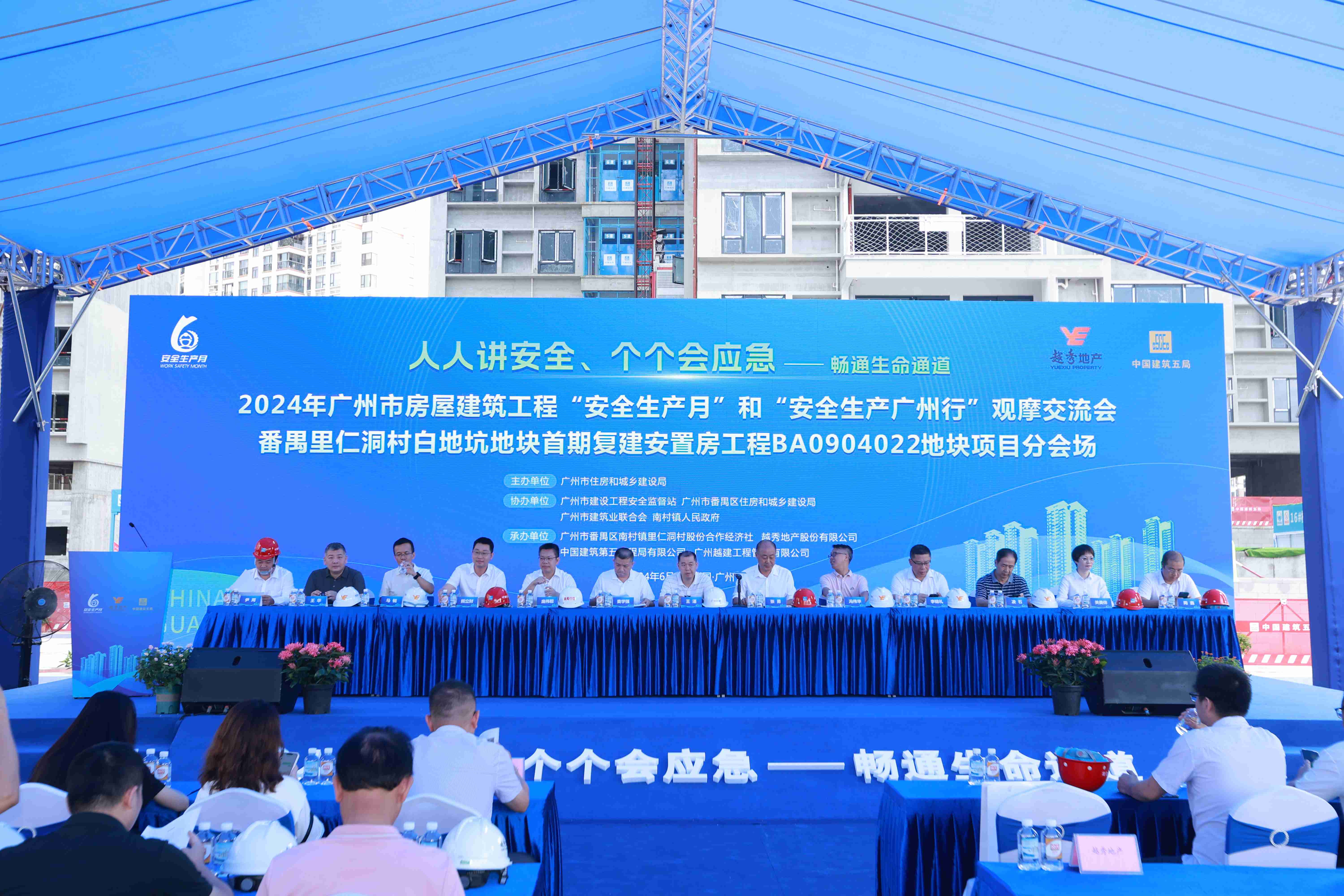按照2024年廣州市房屋建筑工程“安全生產月”和“安全生產廣州行”活動的統一部署,由廣州市住房和城鄉建設局主辦,廣州市建筑業聯合會協辦的2024年廣州市房屋建筑工程“安全生產月”和“安全生產廣州行”觀摩交流會分會場,于6月26日上午,在中國建筑第五工程局有限承建的番禺里仁洞村白地坑地塊首期復建安置房工程BA0904022地塊項目成功舉辦。廣州市各地市相關部門、行業協會、施工企業有關負責人等300余人參加觀摩活動。