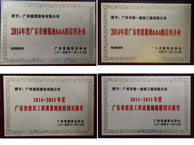 近年來,公司在上級單位的領(lǐng)導(dǎo)下,深入開展建設(shè)質(zhì)量強省活動,不斷推進(jìn)工程質(zhì)量創(chuàng)優(yōu),積極創(chuàng)建中國建設(shè)工程魯班獎, 成績顯著,涌現(xiàn)了一大批精品工程,并連續(xù)獲得四項中國建設(shè)工程魯班獎?;诖?,股份公司及一建公司也雙雙被授予“2014-2015年度廣東省建設(shè)工程質(zhì)量創(chuàng)優(yōu)特別貢獻(xiàn)獎”榮譽稱號。