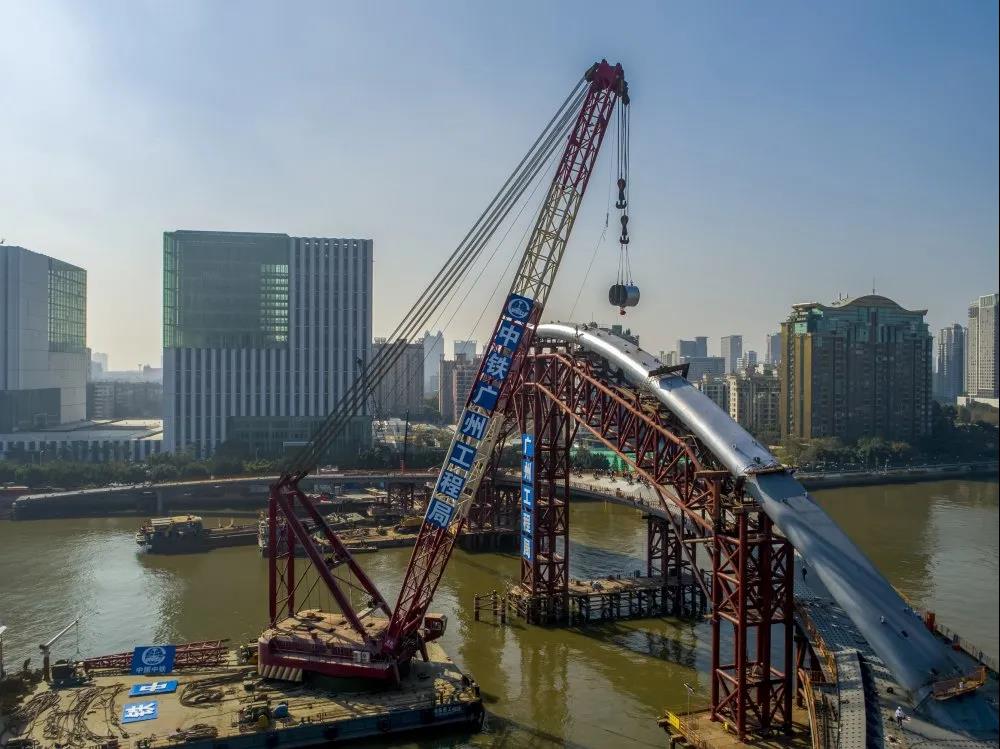 大橋主跨為198米,全長488米,橋面最大寬度為15米。橋梁建設具有主梁結構呈曲型、拱肋橫向側斜、橋梁跨度大三大特點,具有梁拱制作安裝精度高、線形控制要求嚴、運輸吊裝風險大、施工水域及周邊區域環境復雜四大難點。中鐵廣州局的建設者們歷經13個月的緊張有序施工,終于迎來了勝利開通的歷史性時刻。