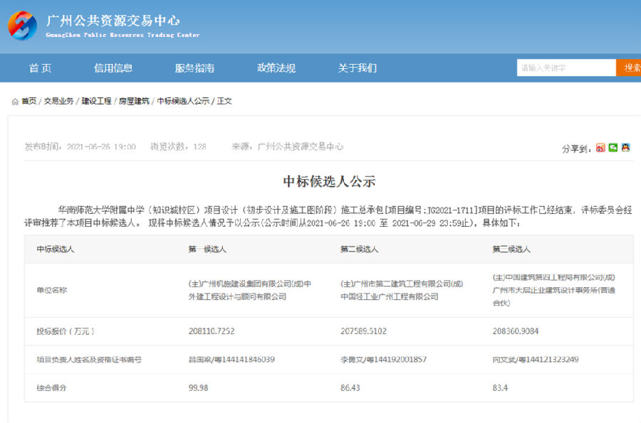 6月26日,公司成功中標(biāo)項目——華南師范大學(xué)附屬中學(xué)(知識城校區(qū))項目設(shè)計(初步設(shè)計及施工圖階段)施工總承包,項目中標(biāo)價為20.81億元。