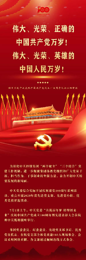 初心易得,始終難守,百年恰是風(fēng)華正茂。在中國共產(chǎn)黨成立百年之際,中天控股集團(tuán)迎來了定名改制的第25個(gè)年頭,在中國共產(chǎn)黨的正確領(lǐng)導(dǎo)下,在紅色基因的引領(lǐng)下,中天定不負(fù)時(shí)代,不負(fù)韶華,不負(fù)黨和國家的殷切希望,中天的轉(zhuǎn)型升級必定昂揚(yáng)闊步,不斷邁向高質(zhì)量發(fā)展的未來。