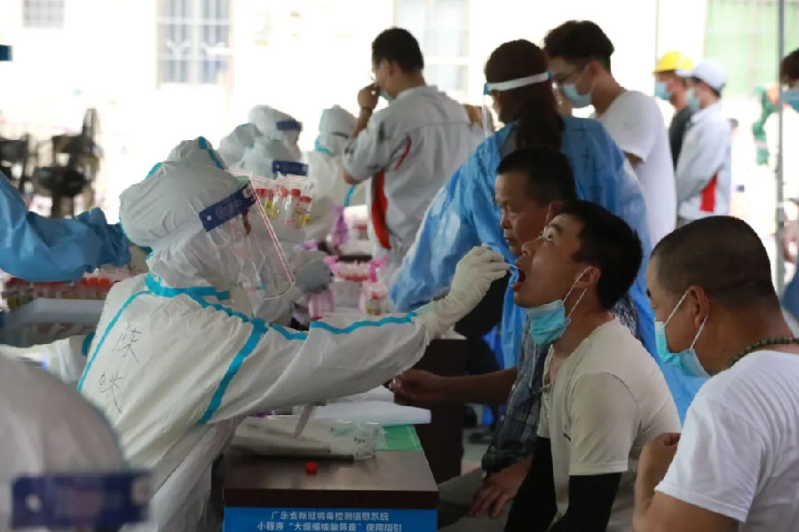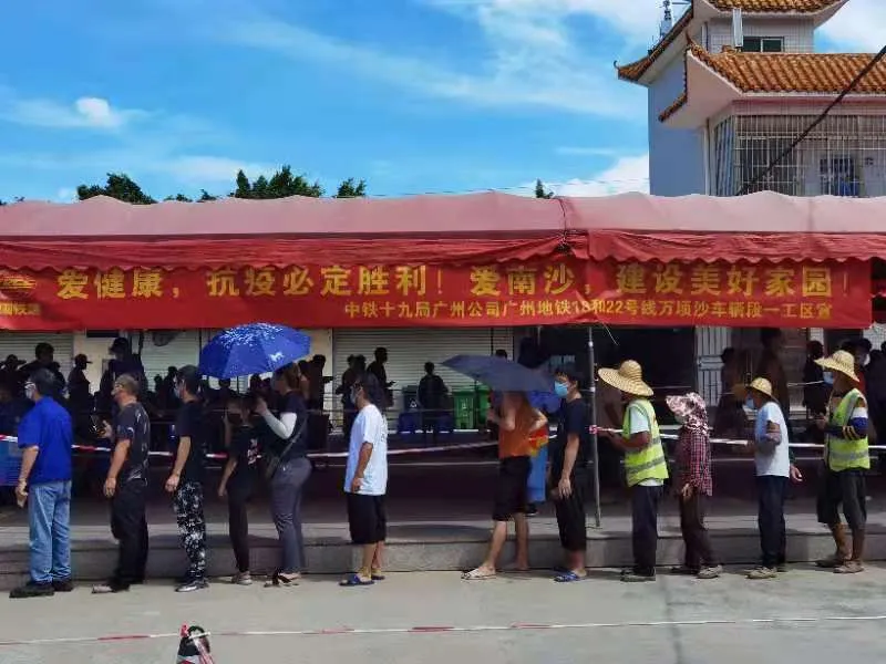 6月11日,廣州市南沙區(qū)珠江街開展第三輪全員核酸檢測,中鐵十九局集團(tuán)廣州工程有限公司高度重視,積極響應(yīng)當(dāng)?shù)卣栒伲⒓丛诠舅鶎偃f頃沙車輛段項(xiàng)目一工區(qū)、二工區(qū)、萬頃沙保稅港項(xiàng)目抽調(diào)職工志愿者51人,到核酸檢測點(diǎn)進(jìn)行疫情防控志愿服務(wù)工作。志愿者們用最短的時(shí)間完成防疫基礎(chǔ)知識培訓(xùn),提前到達(dá)核酸檢測點(diǎn),協(xié)助現(xiàn)場醫(yī)務(wù)人員,組織村民有序開展核酸檢測工作。