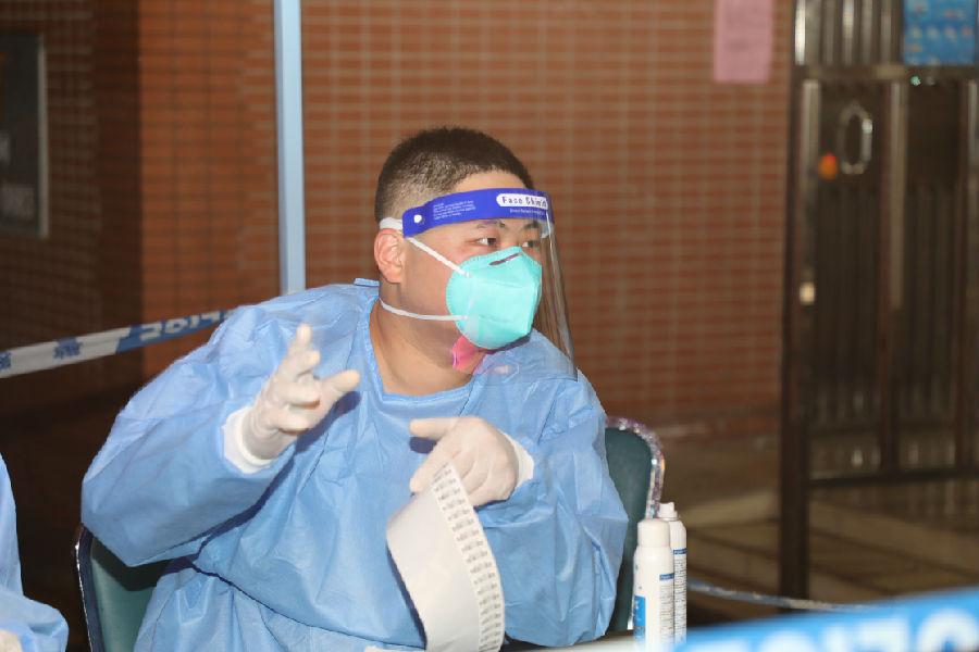 當天上午烈日當空,35攝氏度的氣溫從穿上防護服的那一刻就開始汗流不止。但面對排起長隊的街坊,看見市民群眾焦急等待的目光,他們也心急如焚,生怕會有群眾中暑而暈倒,就特意為老弱病殘者打開綠色通道,這促使余園園等人更加集中精力,全力以赴,忘我工作,只為盡快幫助群眾登記好信息,順利完成核酸檢測采樣。