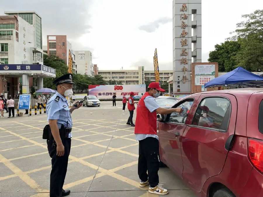 在得知此消息后,項目書記鄭旭立即組織20名志愿者,在佛山市西樵高級中學考點設立“助力高考志愿服務站”。在學校門口,為進入考場的學生家長車輛監測體溫并提醒家長佩戴好口罩,免費提供口罩、洗手液、礦泉水、紙巾、防暑降溫物品,嚴格落實各項防疫要求。