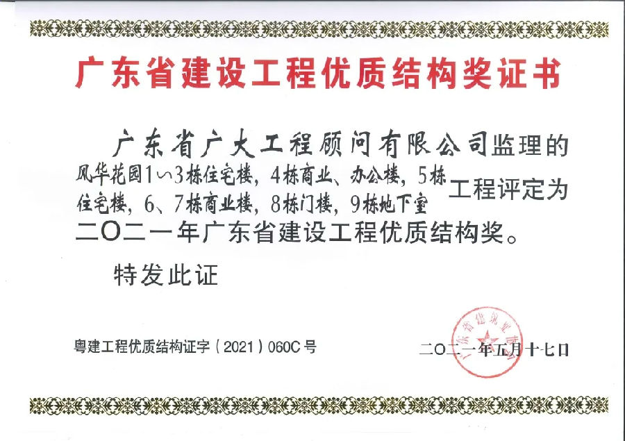 此外,由廣東省廣大工程顧問有限公司承監的"風華花園1~3棟住宅樓,4棟商業樓,辦公樓,5棟住宅樓,6、7棟商業樓,8棟門樓,9棟地下室"項目同時榮獲“2021年廣東省建設工程優質結構獎”、“2020年廣東省房屋市政工程安全生產文明施工示范工地”!