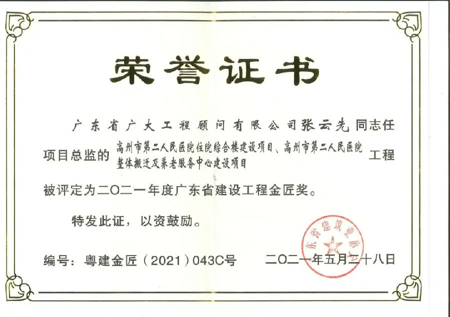 喜訊連連捷報傳,項目獲獎疊疊起。近日,由廣東省廣大工程顧問有限公司承監的“高州市第二人民醫院”項目同時獲得“2021年度廣東省建設工程金匠獎”、“2021年度廣東省建設工程優質獎”,兩項省級榮譽?!帮L華花園1~3棟住宅樓,4棟商業樓,辦公樓,5棟住宅樓,6、7棟商業樓,8棟門樓,9棟地下室"項目同時獲得“2021年廣東省建設工程優質結構獎”、“2020年廣東省房屋市政工程安全生產文明施工示范工地”。廣東省建設工程金匠獎是廣東省建筑行業工程質量的最高榮譽獎。