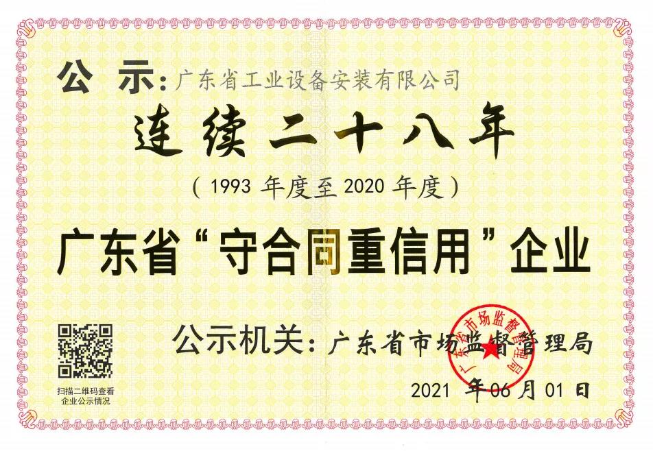 近日,廣東省市場監督管理局公示了2020年度廣東省守合同重信用企業名單,公司憑借良好的信用體系建設,獲得了“廣東省守合同重信用企業”榮譽稱號。至此,公司已連續28年獲得該項殊榮。