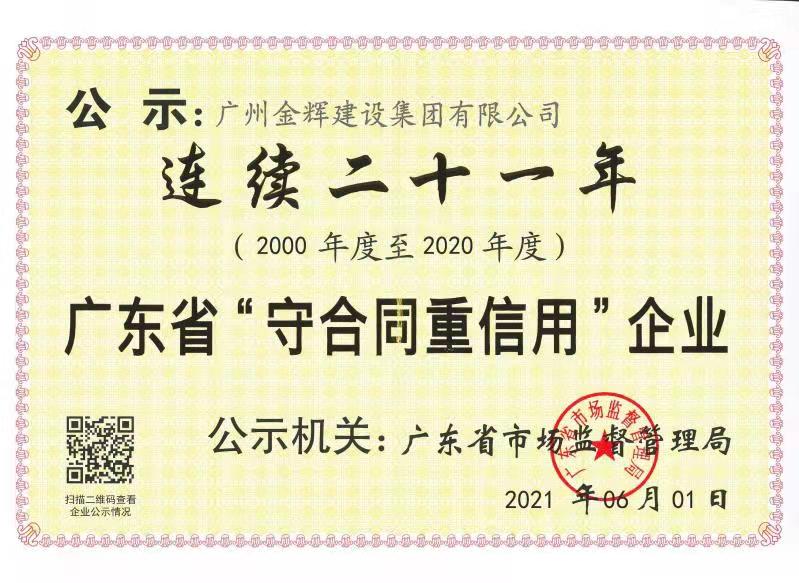 廣州金輝建設集團自成立至今,堅持將信用建設融入到品牌和企業(yè)文化建設中,嚴格按照國家法律法規(guī)、行業(yè)規(guī)定的要求,執(zhí)行規(guī)范和強制性標準。通過對項目招投標、合同管理、項目預結算、質量管理、竣工交付等建立完善運行機制,實施科學的監(jiān)控管理,加強企業(yè)信用體系建設,將“守合同重信用”體現(xiàn)于每一項金輝工作中,自覺承擔起共同捍衛(wèi)和營造信用市場的責任。用實際行動踐行“共謀、共創(chuàng)、共贏、共享”經(jīng)營理念,進一步提升了“金輝建設”品牌和塑造了良好的企業(yè)形象。“廣東省守合同重信用企業(yè)”這份榮譽已經(jīng)陪伴金輝走過了奮斗前行的二十一載(2000年度至2020年度),是金輝人向社會和政府信用考核和監(jiān)管邁出的滿意腳步。但每一步都是艱辛的付出,都是金輝人努力艱難前行的堅定腳步。
