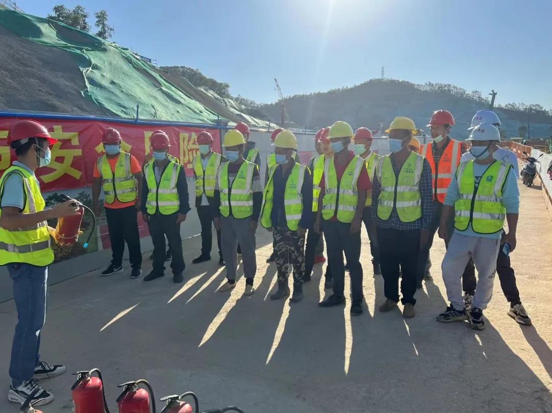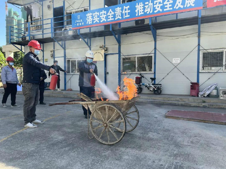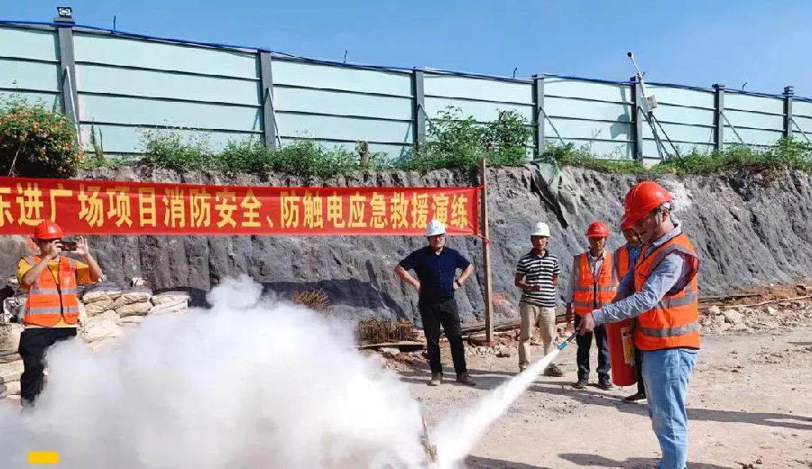 演練活動內容包括消防安全知識教育學習、模擬施工現場發(fā)生火災應急救援、搶救急救受傷昏迷人員。演練首先由物業(yè)消防主管結合建筑工地的實際情況,對在場人員講解項目施工區(qū)、辦公區(qū)、宿舍區(qū)用火用電的消防常識,滅火器材使用要領及示范,電動車充電注意事項等消防安全知識。