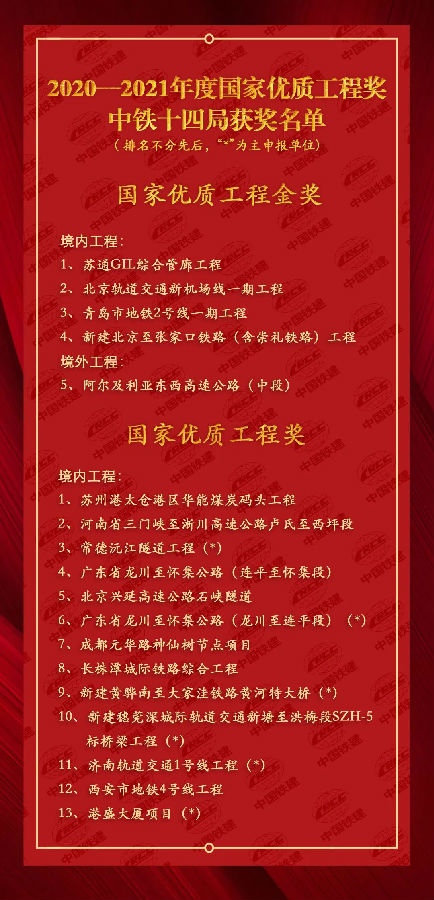 12月7日,中國施工企業管理協會公布《關于表彰2020—2021年度國家優質工程獎的決定》,決定授予43項工程為國家優質工程金獎,687項工程為國家優質工程獎。連同2020年底公布的第一批7項獲獎工程,在本次國家優質工程獎評選周期內,中鐵十四局共獲得5項國家優質工程金獎、13項國家優質工程獎,其中作為主申報單位獲獎6項。