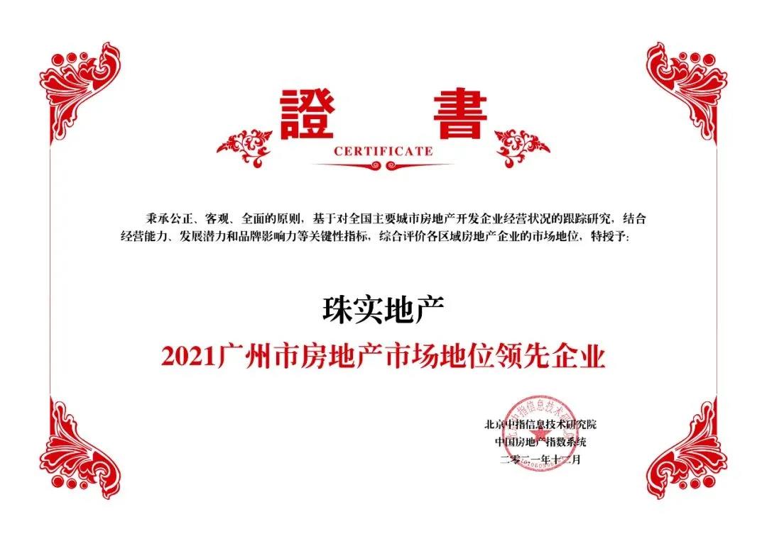 2021年12月2日,由北京中指信息技術研究院主辦,中國房地產指數系統、中國物業服務指數系統承辦的“2021 中國房地產大數據年會暨2022 中國房地產市場趨勢報告會”在北京隆重召開。報告顯示,珠實集團旗下珠實地產榮列“2021廣州市房地產市場地位領先企業”第4名;珠江城市服務榮獲“2021粵港澳大灣區物業服務市場地位領先企業”;由珠江實業開發操盤,珠江城市服務提供物業服務的 珠江花城項目榮獲“2021廣州市物業服務標桿項目”。