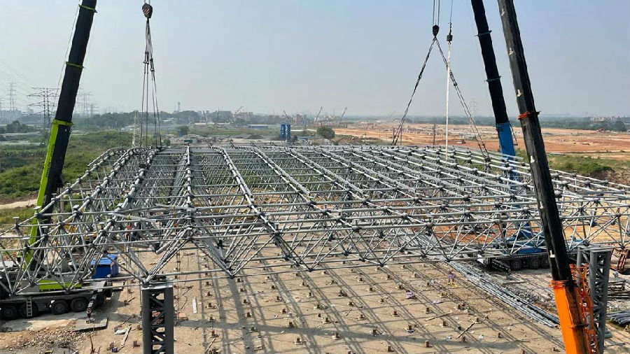 ▲智能大門鋼結(jié)構(gòu)吊裝完成