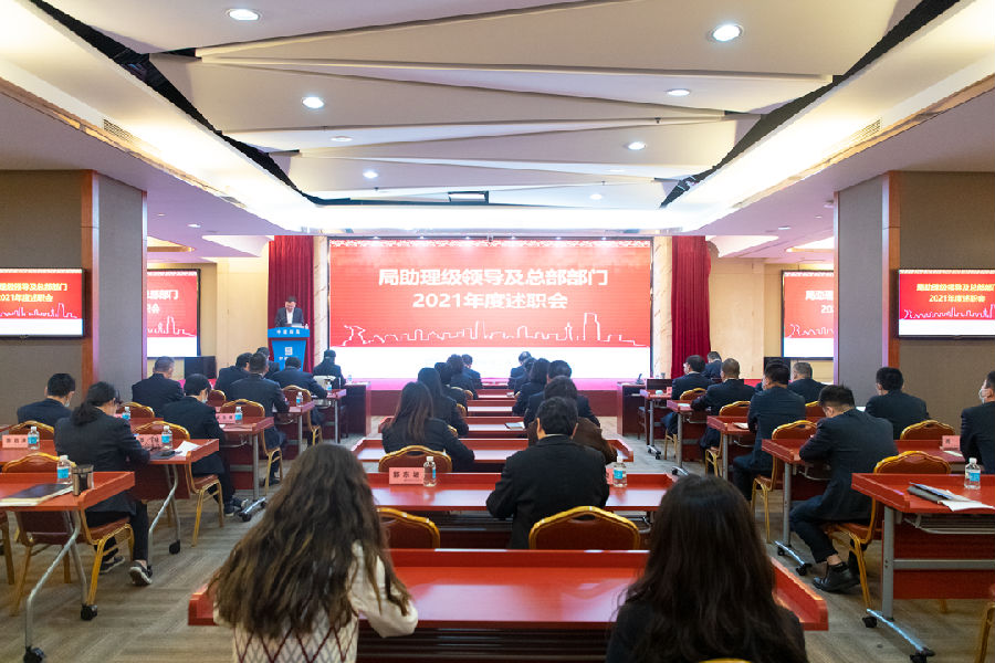 5位局助理級領導和17位總部部門負責人依次上臺述職,總結2021年度亮點工作,深入剖析存在的不足,系統提出2022年各項工作計劃。