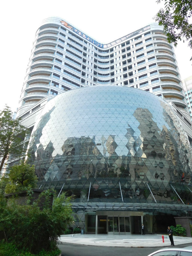 醫療樓和科研樓的整體建筑立面外形為多曲面、球體的結構造型,對于混凝土結構和建筑裝飾施工來說,施工放線的圓曲面控制、整體垂直控制難度大。