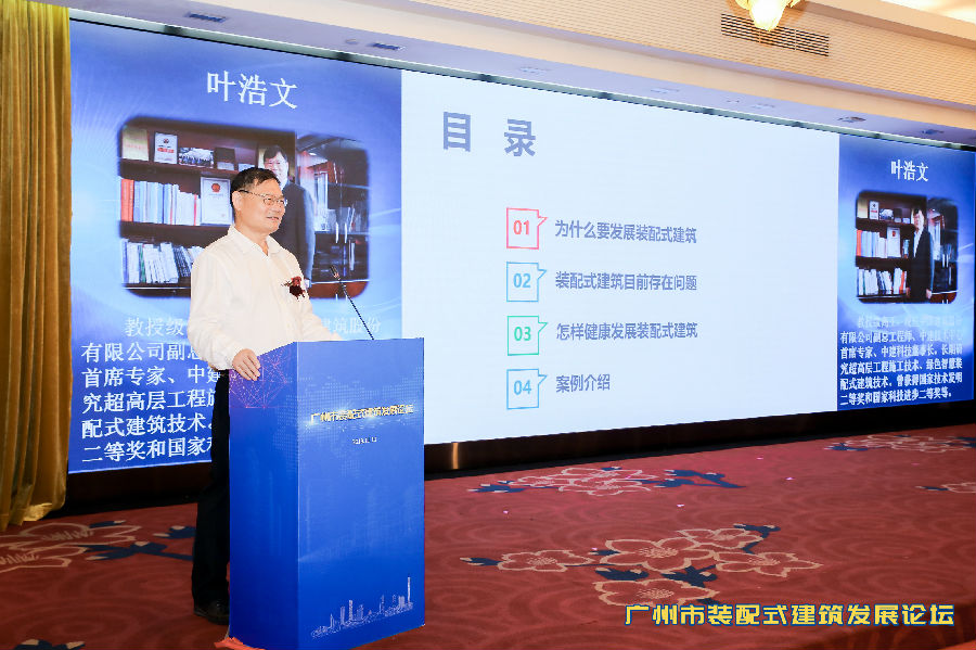 中建科技有限公司董事長葉浩文指出裝配建筑的發展離不開數字建造、綠色建造,并介紹了深圳長圳公租房項目采用裝配式建筑的成功做法;