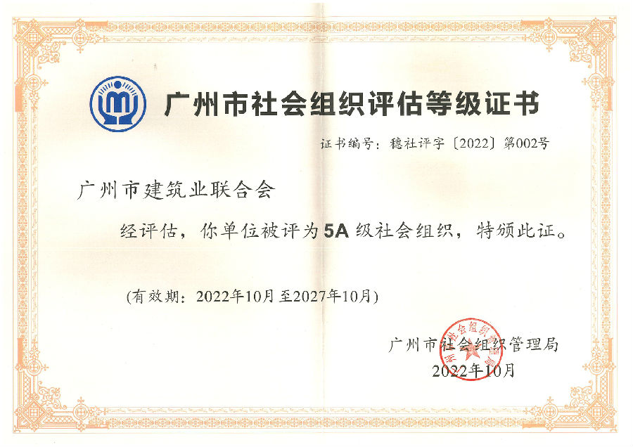2010年,廣州市建筑業聯合會喜獲廣州首批評估的5A級社會組織榜首的殊榮,這是政府和社會各界對廣州市建筑業聯合會工作的肯定和認同。2016年,我會順利通過廣州市5A級社會組織復評;去年,我會第二次成功通過廣州市5A級社會組織復評。多年來,我會在廣州市民政局、廣州市住建局等部門的關心指導下,認真履行“提供服務,反映訴求,規范行為”的宗旨,緊緊圍繞廣州城鄉建設中心工作,充分發揮橋梁和紐帶作用,始終踐行政府期望是我們的努力方向、企業需求是我們的服務宗旨、行業發展是我們的追求目標。