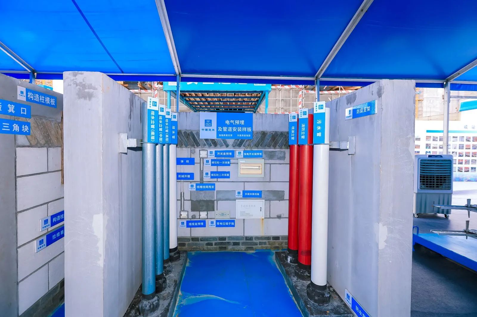 策劃先行,精益求精,項目踐行“一次成優”理念,嚴格落實“三級交底”制度,根據工程“難點、痛點”召開質量創優策劃,通過地下室工序、地上室內工序,外立面及屋面、室外工程四大工序穿插,減少多余工序、提高一次成優率全面建立驗收掛牌、樣板引路、檢驗試驗、材料標識、成品保護等,多個全過程質量管理可視化工作機制,重點做好材料把控、過程管控、成品保護等工作,推進現場質量風險管控,降低質量風險。