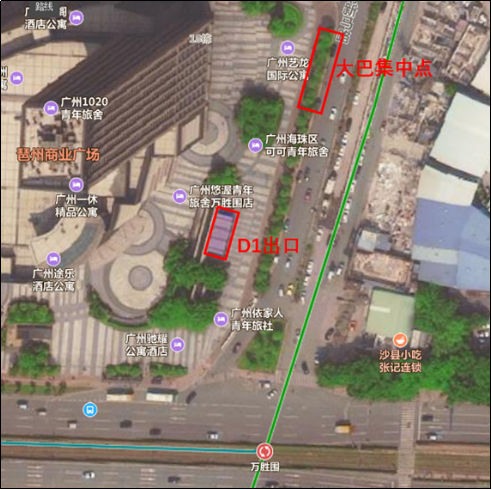 本次觀摩會將統一安排車輛,參會人員于11月30日中午13:20前在廣州市海珠區萬勝圍地鐵站D出口步行200米處(如圖1所示)搭乘大巴,大巴將于13:30準時出發前往觀摩會現場,請參會人員務必在規定時間內搭乘大巴。