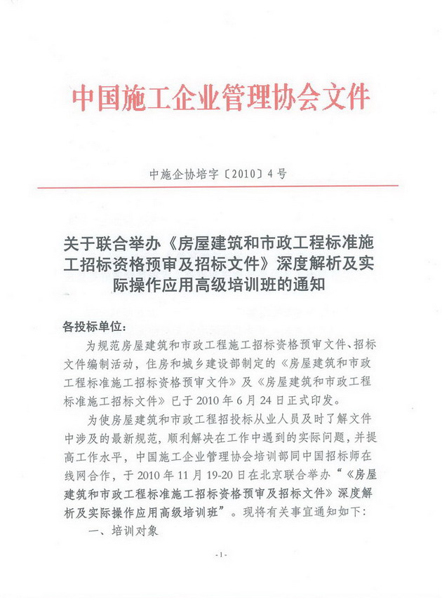 轉發中施企協“關于聯合舉辦《房屋建筑和市政工程標準施工招標資格預審及招標文件》深度解析及實際操作應用高級培訓班的通知”的通知