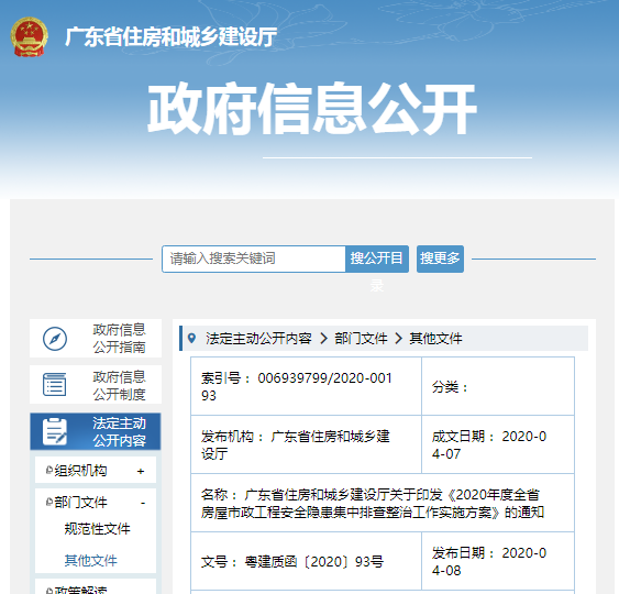 為深入貫徹習(xí)近平總書記關(guān)于安全生產(chǎn)的重要論述和重要批示指示精神,認(rèn)真落實(shí)省委、省政府工作部署,扎實(shí)開展房屋市政工程安全隱患集中排查整治工作,進(jìn)一步提升房屋市政工程安全管理水平和能力,根據(jù)《廣東省安全生產(chǎn)委員會關(guān)于印發(fā)安全生產(chǎn)領(lǐng)域八大專項(xiàng)整治方案的通知》(粵安〔2020〕2號),我廳制定了《2020年度全省房屋市政工程安全隱患集中排查整治工作實(shí)施方案》,現(xiàn)印發(fā)給你們,請認(rèn)真組織實(shí)施。