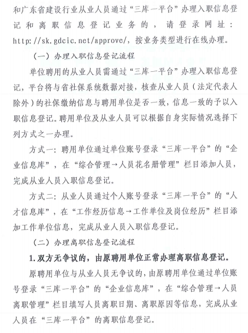 近日,廣東省三庫一平臺管理信息服務系統發布了關于廣東省建設行業從業人員通過“三庫一平臺”辦理入職信息登記和離職信息登記業務實施“零跑動”的通知,2021年8月10日起實施。通知明確: