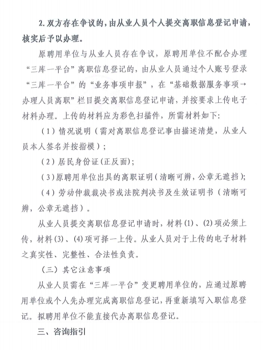 原聘用單位與從業人員存在爭議,原聘用單位不配合辦理“三庫一平臺”離職信息登記的,由從業人員通過個人賬號登錄"三庫一平臺”的“業務事項申報",在"基礎數據服務事項-辦理人員離職”欄目提交離職信息登記申請,并按要求上傳電子材料辦理。上傳的材料應為彩色掃描件,所需材料如下: