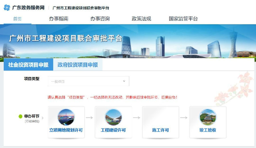申報(bào)單位登錄廣東省政務(wù)服務(wù)網(wǎng)(http://www.gdzwfw.gov.cn/),進(jìn)入廣州市工程建設(shè)項(xiàng)目聯(lián)合審批平臺(tái),選擇“社會(huì)投資低風(fēng)險(xiǎn)項(xiàng)目申報(bào)”,點(diǎn)擊“工程規(guī)劃許可證和施工許可證并聯(lián)審批”,按照系統(tǒng)設(shè)置填寫申請(qǐng)信息及上傳材料后提交。