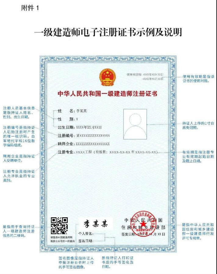 附件:1.一級建造師電子注冊證書示例及說明