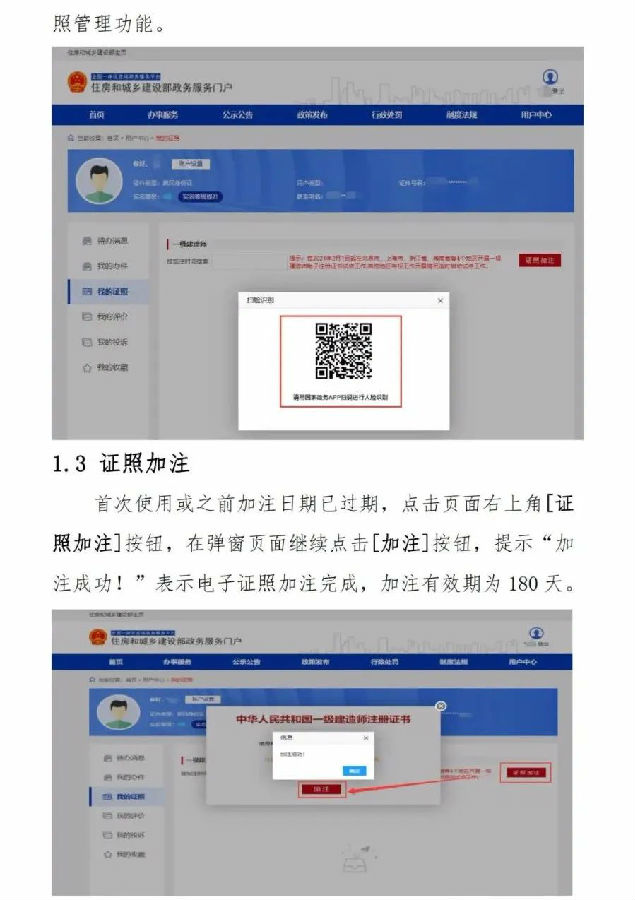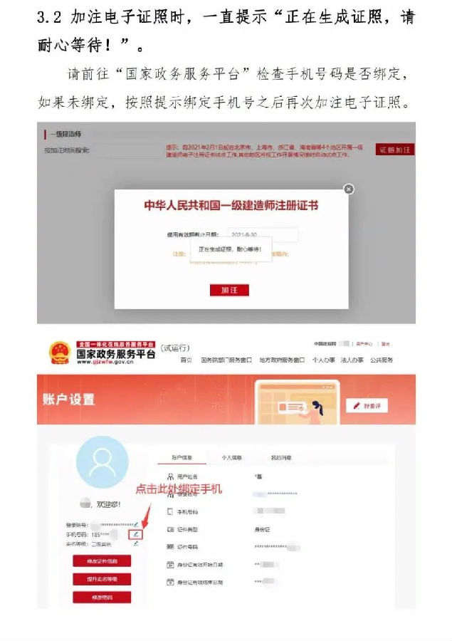 2.自2021年10月15日起,全國范圍內準予一級建造師初始注冊、增項注冊、重新注冊、延續注冊的,不再發放紙質注冊證書或加貼防偽貼;聘用單位基本信息修改的,不再加貼防偽貼;因紙質注冊證書遺失、污損或個人信息修改等需重新發放注冊證書的,不再補發或更換紙質注冊證書。