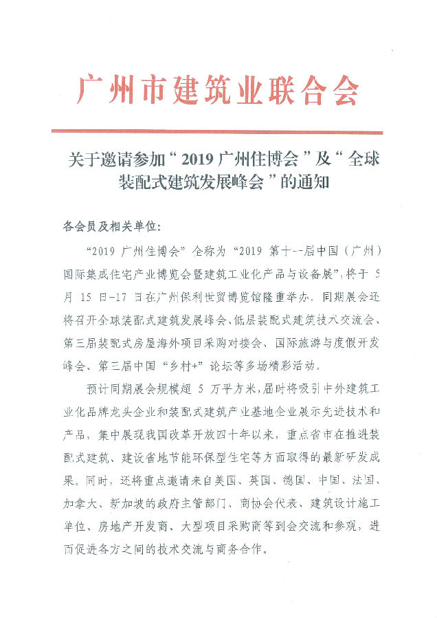 關于邀請參加“2019廣州筑博會”及“全球裝配式建筑發展峰會”的通知