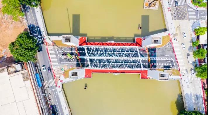 據了解,光明大橋北接長堤西路,南連南堤路,橋頭兩側與被交路均采用平交,該段范圍內路線平面為直線,大橋全長115.857米,其中橋梁全長98.6米,主橋主跨53.6米,橋寬24米,兩側引橋跨均為22.5米,采用雙向4車道,兩側各設4米人行道,橋梁直接與兩側堤岸連接。