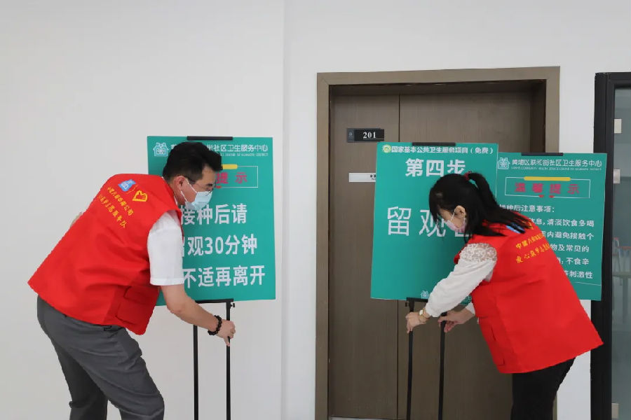 在接種留觀區布置完畢后,志愿者們按照工作指引,在現場安保、登記、測溫、引導和留觀各個崗位擔負相應職責。