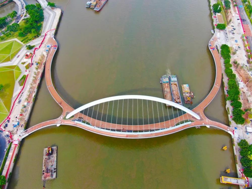 珠江秀水彩云間,長虹飛跨一色天。6月25日,由中鐵廣州局集團承建的廣州首座珠江兩岸人行橋正式開通,這是現今世界上跨度最大的曲梁斜拱人行橋,同時,其全球征名活動也最終揭曉,命名為:“海心橋”(小名:小鳳眼)。