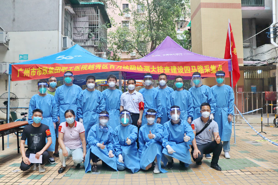 5月30日清晨,余園園等人趕在7:30分前到達越秀區建設街中馬路社區核酸檢測采樣,他們連忙帶上N95口罩、防護面罩、防護服等防疫物資全副武裝后,立即投入工作,為群眾做好信息登記、核實身份等采樣前工作,全力配合市政集團職工醫院醫護人員完成核酸檢測采樣任務。