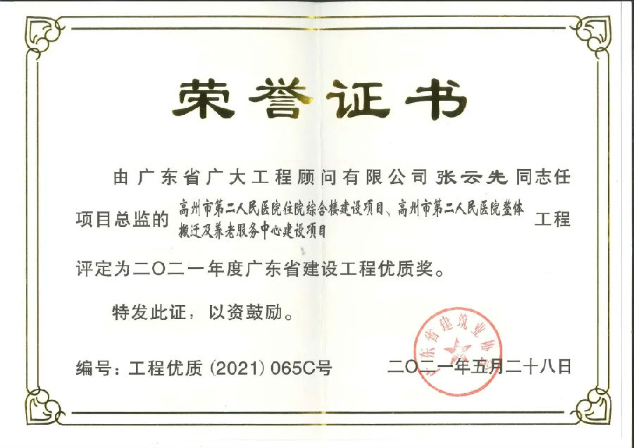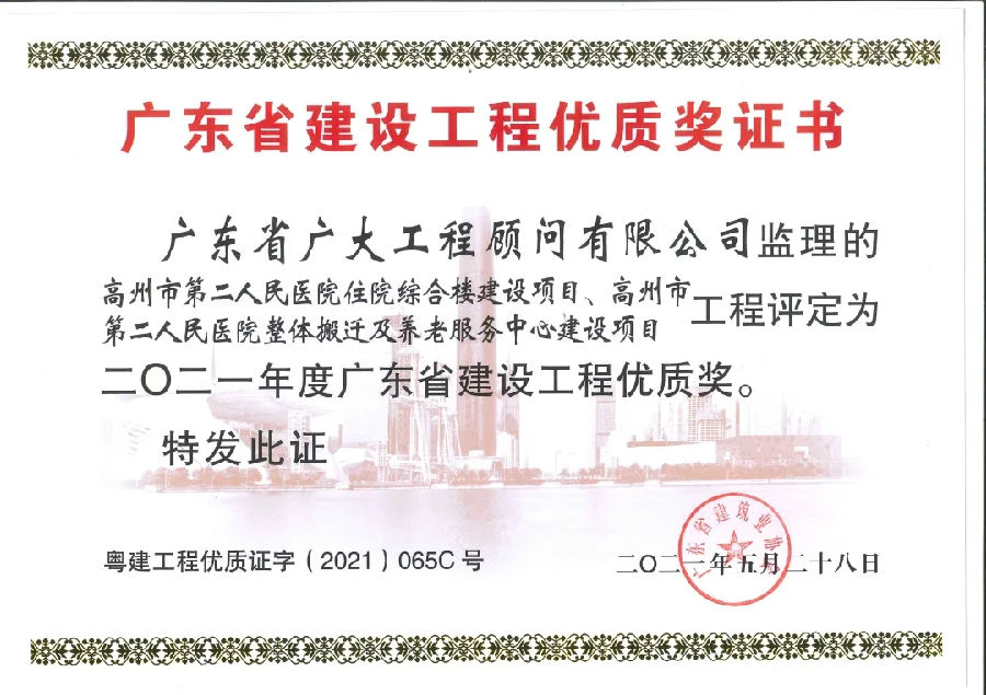 喜訊連連捷報傳,項目獲獎疊疊起。近日,由廣東省廣大工程顧問有限公司承監的“高州市第二人民醫院”項目同時獲得“2021年度廣東省建設工程金匠獎”、“2021年度廣東省建設工程優質獎”,兩項省級榮譽?!帮L華花園1~3棟住宅樓,4棟商業樓,辦公樓,5棟住宅樓,6、7棟商業樓,8棟門樓,9棟地下室"項目同時獲得“2021年廣東省建設工程優質結構獎”、“2020年廣東省房屋市政工程安全生產文明施工示范工地”。廣東省建設工程金匠獎是廣東省建筑行業工程質量的最高榮譽獎。