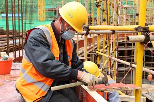 在項目建設現場,除反光背心、安全帽、安全帶之外,口罩成了現場人員的安全第四“寶”,項目部鋪開了一條防疫與生產并行不悖的科學作業線,合力搶抓“7·30”教學樓交付節點。