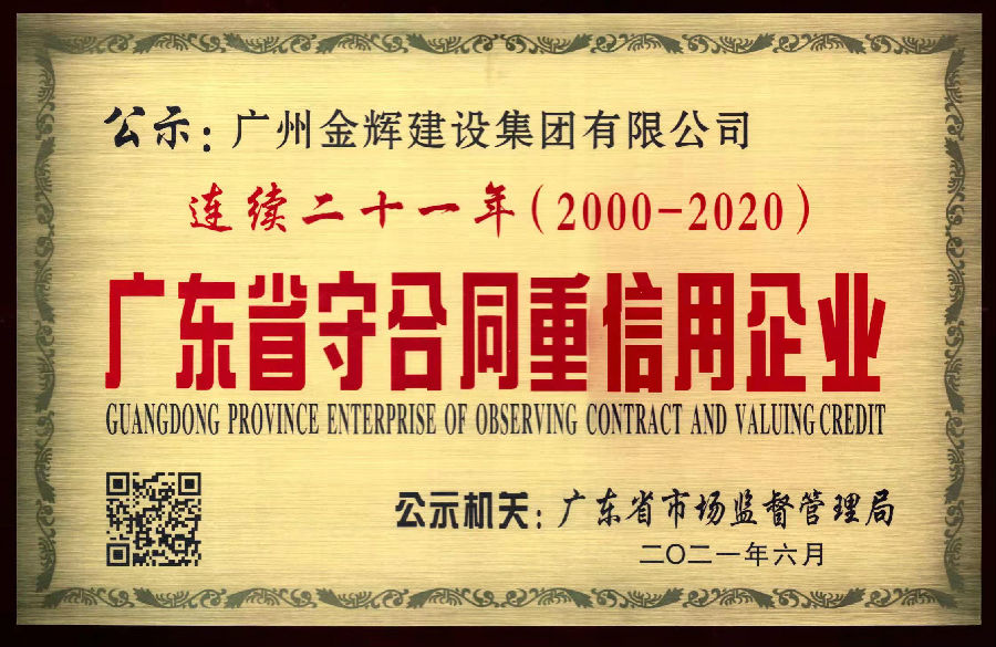廣州金輝建設集團自成立至今,堅持將信用建設融入到品牌和企業(yè)文化建設中,嚴格按照國家法律法規(guī)、行業(yè)規(guī)定的要求,執(zhí)行規(guī)范和強制性標準。通過對項目招投標、合同管理、項目預結算、質量管理、竣工交付等建立完善運行機制,實施科學的監(jiān)控管理,加強企業(yè)信用體系建設,將“守合同重信用”體現(xiàn)于每一項金輝工作中,自覺承擔起共同捍衛(wèi)和營造信用市場的責任。用實際行動踐行“共謀、共創(chuàng)、共贏、共享”經(jīng)營理念,進一步提升了“金輝建設”品牌和塑造了良好的企業(yè)形象。“廣東省守合同重信用企業(yè)”這份榮譽已經(jīng)陪伴金輝走過了奮斗前行的二十一載(2000年度至2020年度),是金輝人向社會和政府信用考核和監(jiān)管邁出的滿意腳步。但每一步都是艱辛的付出,都是金輝人努力艱難前行的堅定腳步。