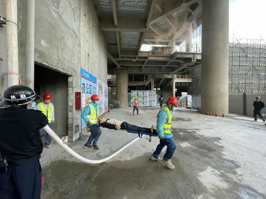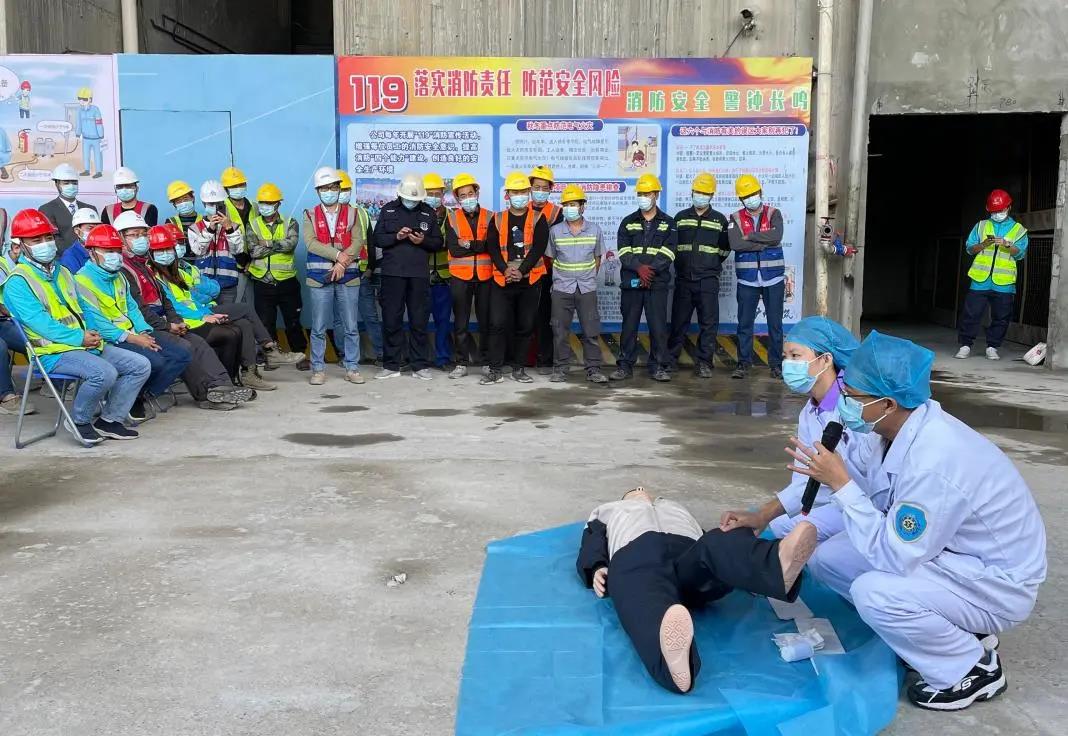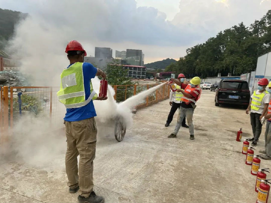 演練活動內容包括消防安全知識教育學習、模擬施工現場發(fā)生火災應急救援、搶救急救受傷昏迷人員。演練首先由物業(yè)消防主管結合建筑工地的實際情況,對在場人員講解項目施工區(qū)、辦公區(qū)、宿舍區(qū)用火用電的消防常識,滅火器材使用要領及示范,電動車充電注意事項等消防安全知識。