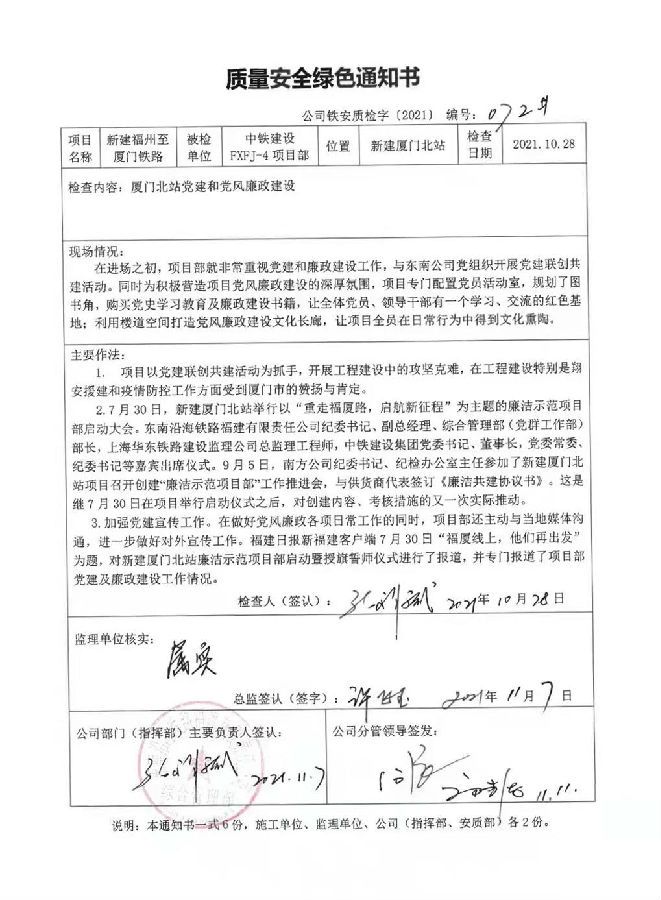 近日,中鐵建設承建的新建廈門北站項目喜獲東南沿海鐵路福建有限責任公司“質量安全綠色通知書”,項目黨建及黨風廉政建設工作成效受到高度評價。這是該項目今年連續第三個月獲單項“綠牌”嘉獎。