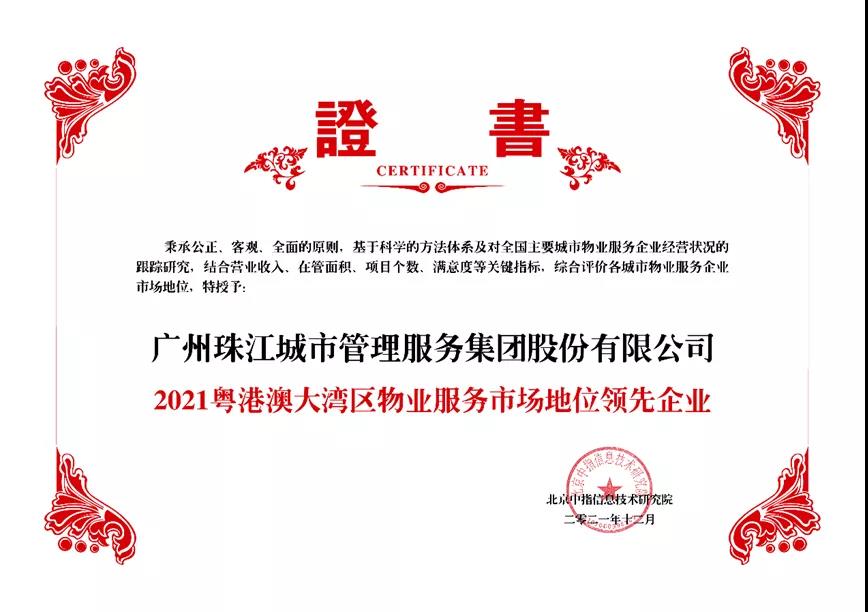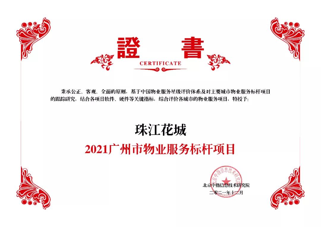 2021年12月2日,由北京中指信息技術研究院主辦,中國房地產指數系統、中國物業服務指數系統承辦的“2021 中國房地產大數據年會暨2022 中國房地產市場趨勢報告會”在北京隆重召開。報告顯示,珠實集團旗下珠實地產榮列“2021廣州市房地產市場地位領先企業”第4名;珠江城市服務榮獲“2021粵港澳大灣區物業服務市場地位領先企業”;由珠江實業開發操盤,珠江城市服務提供物業服務的 珠江花城項目榮獲“2021廣州市物業服務標桿項目”。