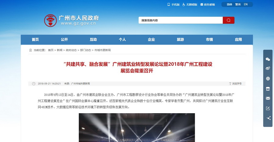 2018年9月13日至14日,由廣州市建筑業聯合會主辦,廣州市工程勘察設計行業協會等單位共同協辦的“廣州建筑業轉型發展論壇暨2018年廣州工程建設展覽會”在廣州國際會展中心隆重召開。近百家相關代表企業和數十位行業精英、專家學者齊聚廣州,共同探討廣州建筑行業在互聯網+BIM技術、大數據應用等前沿技術環境下的轉型升級和發展方向。