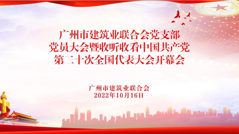 10月16日上午10時(shí),中國共產(chǎn)黨第二十次全國代表大會(huì)在人民大會(huì)堂開幕,習(xí)近平總書記代表第十九屆中央委員會(huì)向黨的二十大作報(bào)告。廣州市建筑業(yè)聯(lián)合會(huì)黨支部組織全體黨員干部集中收聽收看中國共產(chǎn)黨第二十次全國代表大會(huì)現(xiàn)場(chǎng)直播,認(rèn)真聆聽學(xué)習(xí)習(xí)近平總書記代表第十九屆中央委員會(huì)所作的工作報(bào)告。