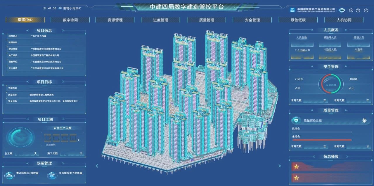 項目廣泛運用智慧平臺,并將其全方位融入到方案策劃,設計優化、施工管理中,將虛擬技術與實體建筑相結合,用“智慧大腦”賦能建造品質提升,并采用鷹眼數字孿生智慧施工監管平臺,結合360°全景視角,實時、全面地在線監控,施工現場的質量、安全及進度情況,實現對現場的全局掌控,促進精細化生產,提高工程質量水平