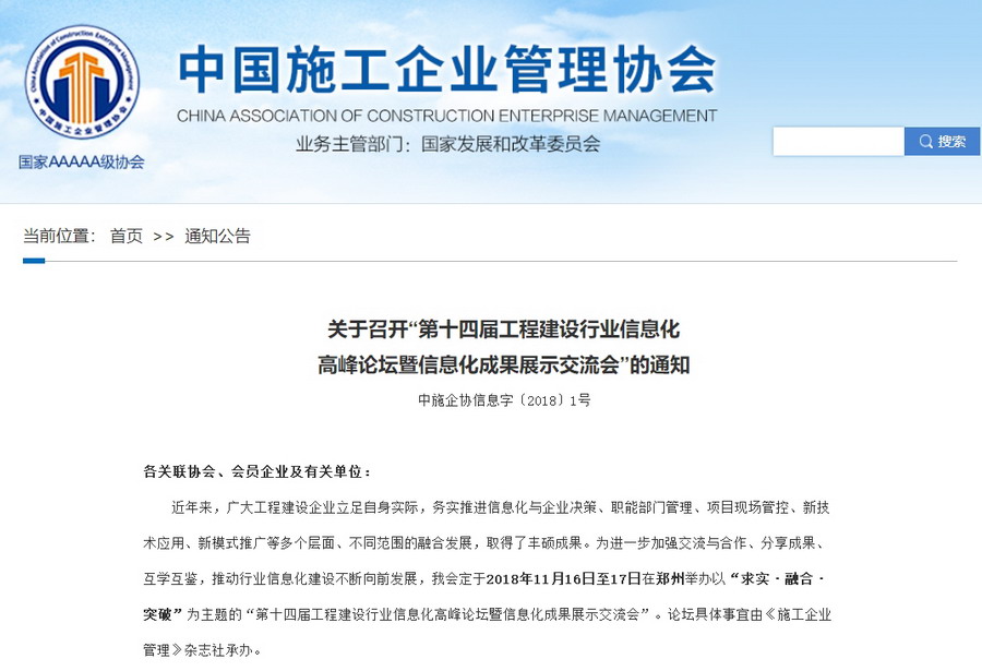 【轉發】中施企協關于召開“第十四屆工程建設行業信息化高峰論壇暨信息化成果展示交流會”的通知